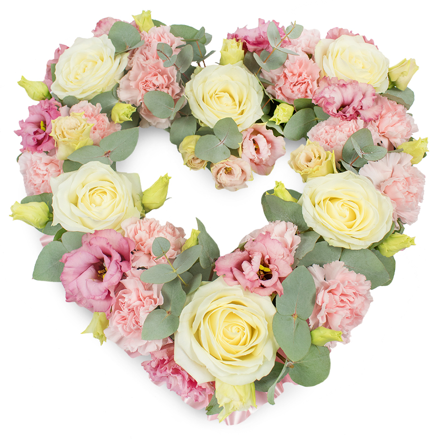 Show your deepest appreciation with our stunning heart tribute bouquet. This elegant arrangement features a blend of white roses, pink carnations, pink lisianthus, and eucalyptus leaves, artfully designed to convey your heartfelt message.